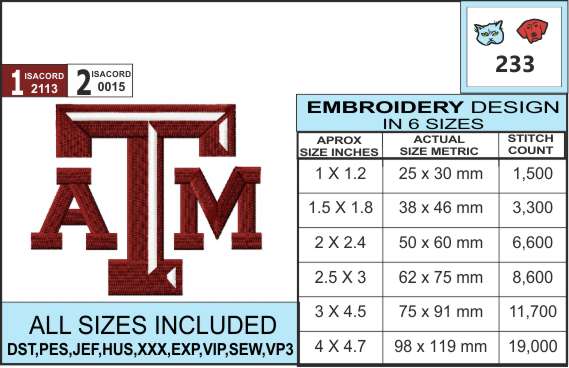 Included here are all 6 sizes of the Texas A&M Embroidery Design . Check out the attached infocharts for exact dimensions and stitch counts.