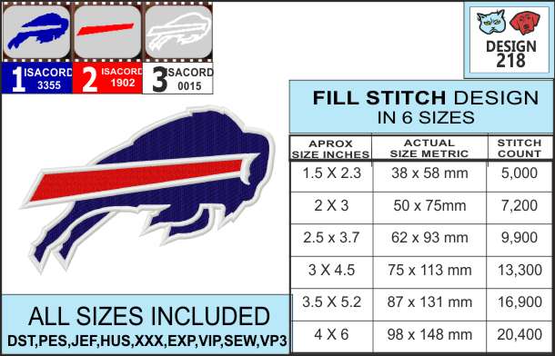 Included here are all 6 sizes of the Buffalo Bills Embroidery Design . Sizes range from 2.3 to 6 inches wide. Check out the attached info-chart for exact dimensions and stitch counts. Simple applique instructions are included.