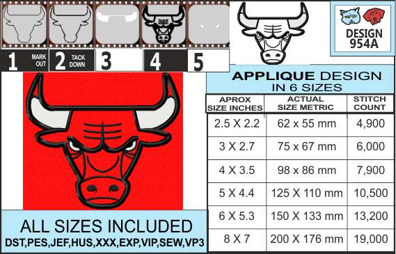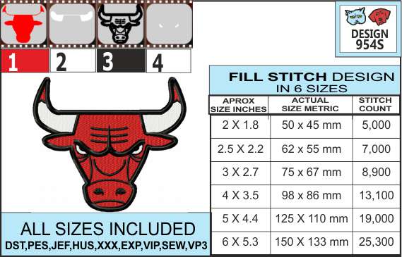 Included here are all 12 sizes of the Chicago Bulls Embroidery Logo . That’s 6 sizes in fill stitch embroidery. Plus 6 sizes in outline / applique. Sizes range from 2 to 8 inches. Check out the attached infocharts for exact dimensions and stitch counts.