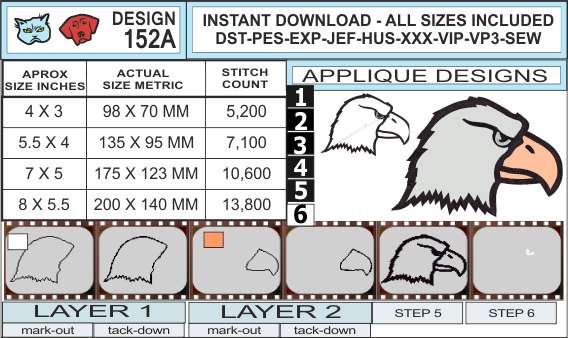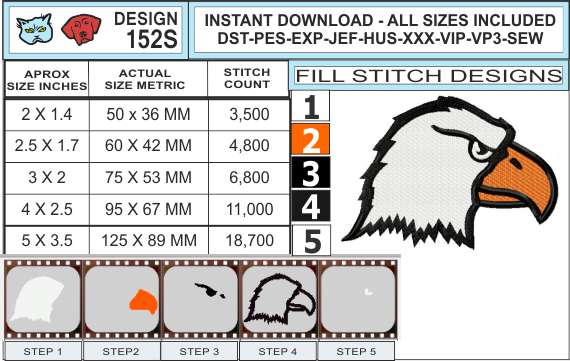 Included here are all 9 sizes of the Eagle Head Embroidery Logo . That’s 5 sizes in fill stitch embroidery. Plus 4 sizes in outline / applique. Sizes range from 2 up to 8 inches. Check out the attached infocharts for exact dimensions and stitch counts.